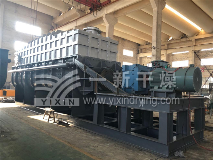 ??干燥機以蒸汽、熱水或導熱油作為加熱介質,軸端裝有熱介質導入導出的旋轉接頭。加熱介質分為兩路,分別進入干燥機殼體夾套和槳葉軸內腔,將器身和槳葉軸同時加熱,以傳導加熱的方式對物料進行加熱干燥。物料連續送入干燥機加料口,物料進入器身后,通過槳葉的轉動使物料翻轉、攪拌,不斷更新加熱界面,與器身和槳葉接觸,被充分加熱,使物料所含的表面水分蒸發。同時,物料隨槳葉軸的旋轉成螺旋軌跡向出料口方向輸送,在輸送中繼續攪拌,使物料中滲出的水分繼續蒸發。然后,干燥均勻的合格產品由出料口排出。