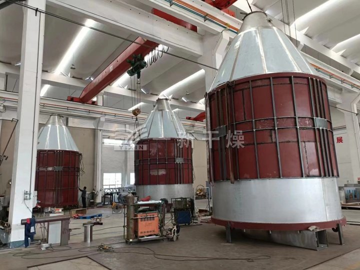 ??減水劑專用干燥機由熱風爐燃燒產生的高溫熱風,從干燥室頂部蝸殼通道進入,在熱風分配器的作用下產生均勻旋轉的氣流快速進入干燥室內,并保持塔內布風均勻。減水劑等液體物料通過高速旋轉的霧化器,產生分散微細的料霧,料霧與旋流的熱空氣接觸,水分迅速蒸發,在極短的時間內物料得以干燥,得到中空、壁薄的球狀產品,該產品在水中能迅速溶解。